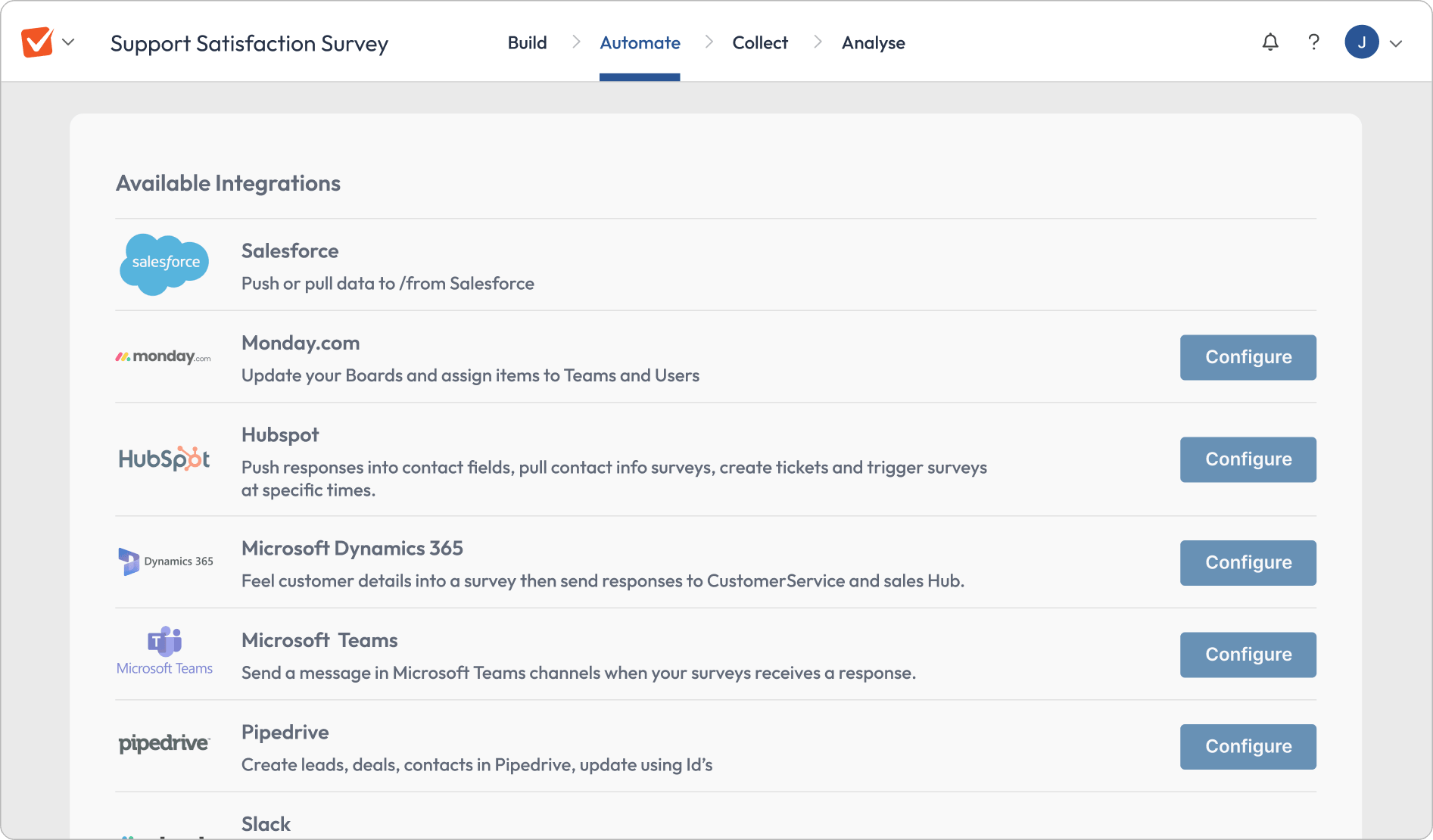Deliver surveys via email or SMS – built-in, not bolted on.