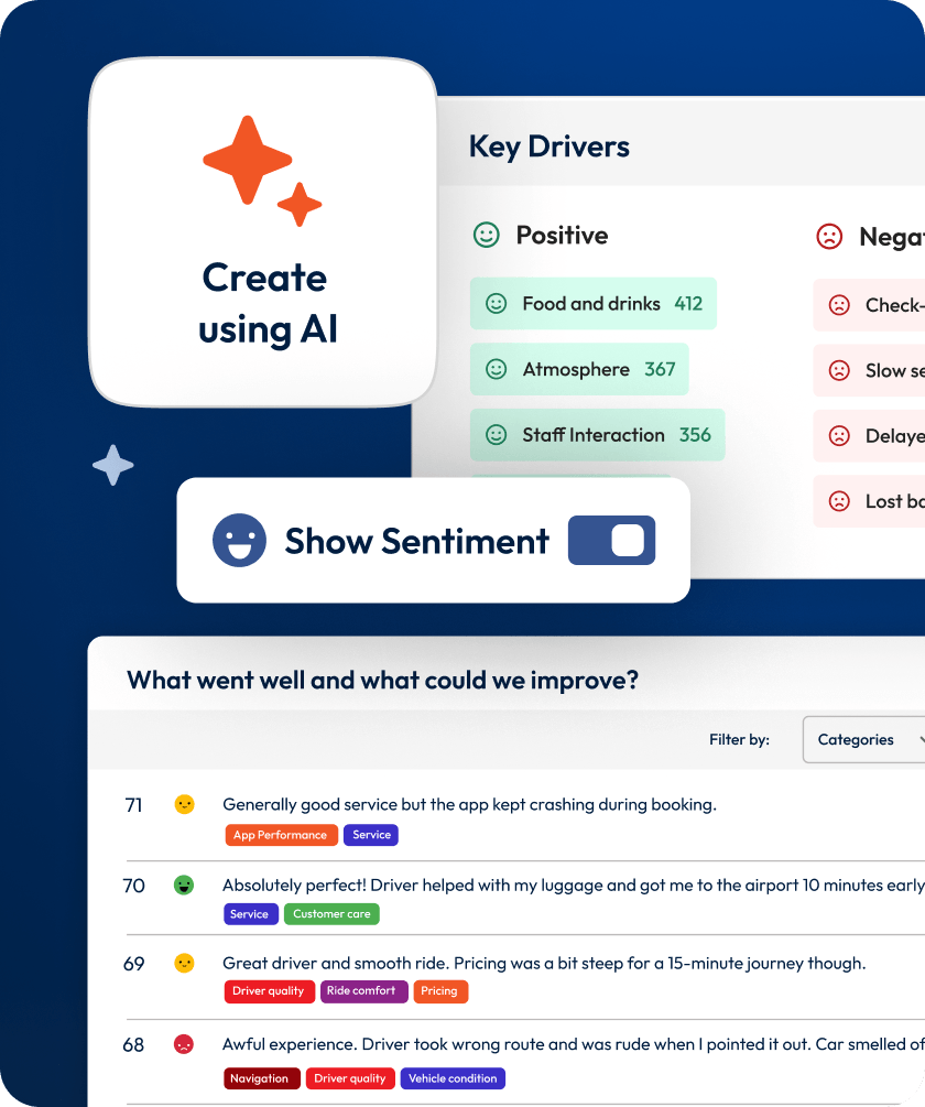 Go from overwhelming feedback to clear priorities. AI categorises responses, surfaces the biggest issues, and helps you find root causes.