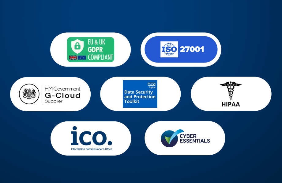 NHS Data Security and Protection Toolkit approved with ISO27001 and Cyber Essentials Plus certification. 100% UK data hosting with full audit trails means you get sign off without lengthy reviews or additional assessments.