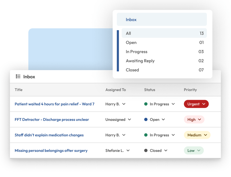 Turn a negative NHS Friends and Family Test response into a tracked case with one click. Assign, respond, resolve in one place. - See exactly who did what and when