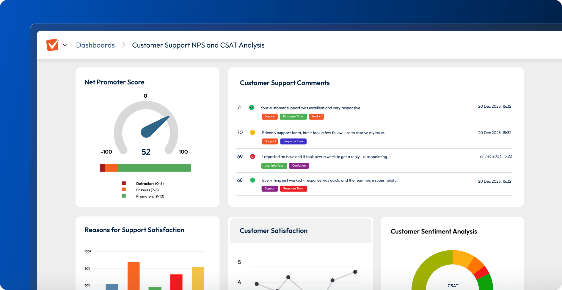 Get insights fast with reports, dashboards & text analysis