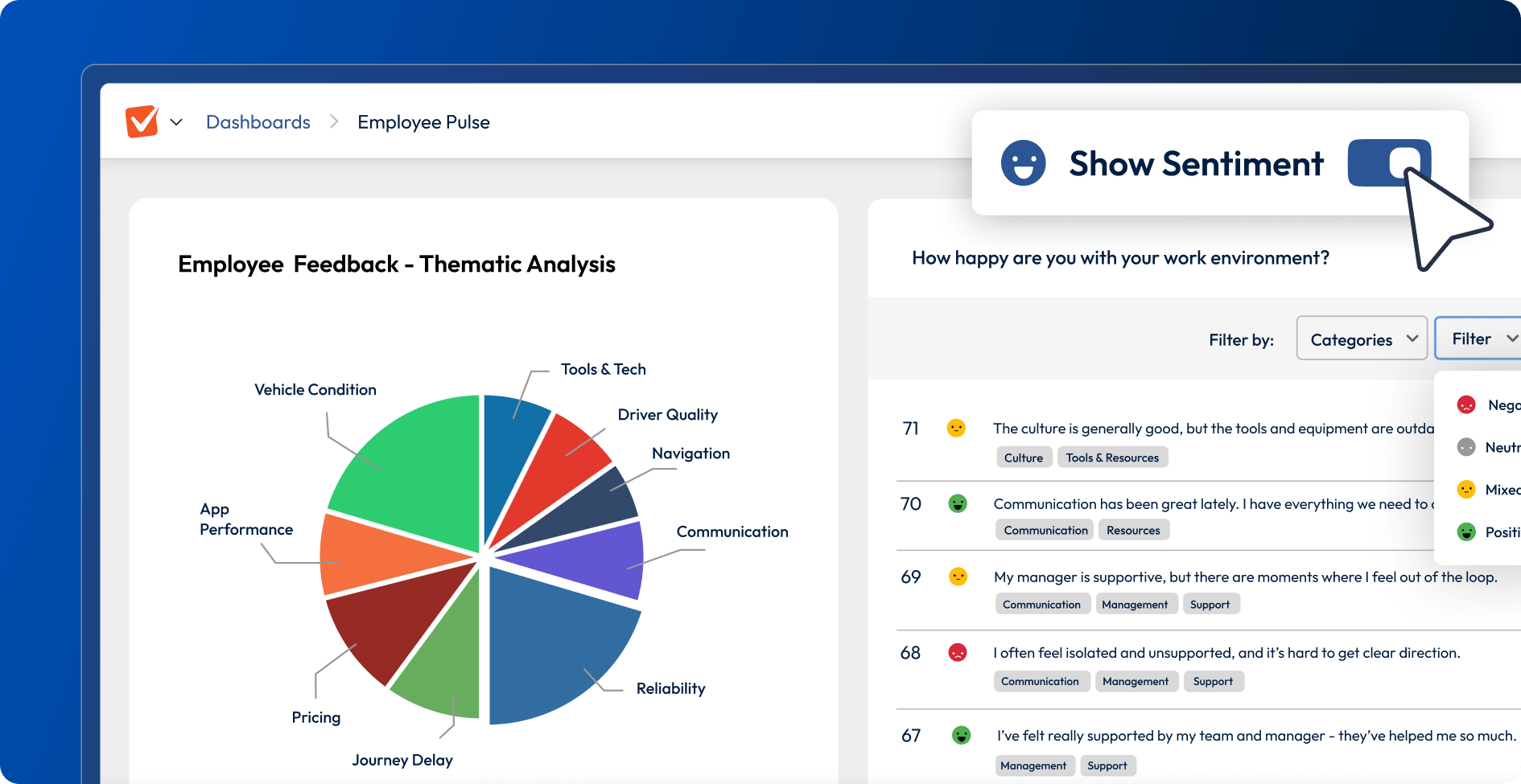 See which topics are generating the most feedback and track sentiment over time.
