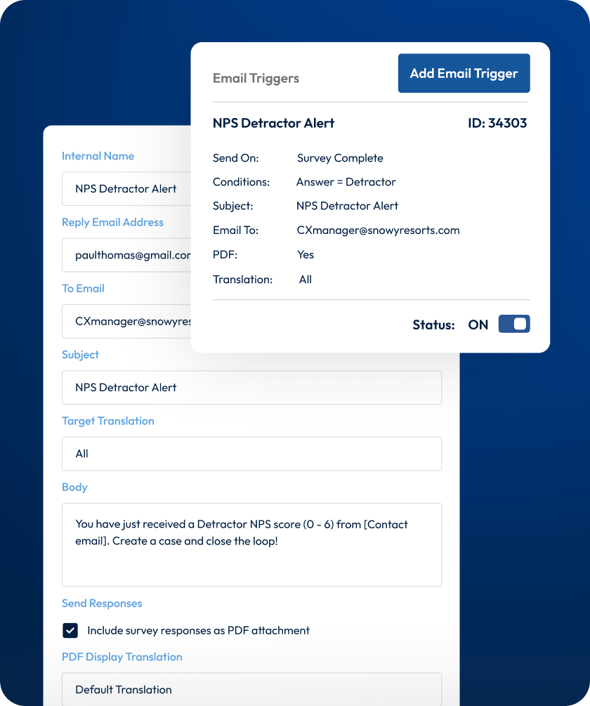 Yes. You can create multiple triggers on a single survey, each with its own conditions and recipients. A low satisfaction score at one location can alert the site manager, while a complaint at another goes straight to the regional lead. Route by score, answer, location, or any custom variable.