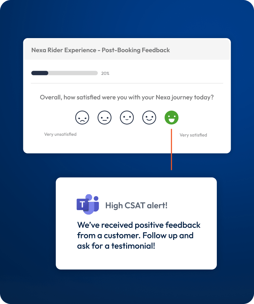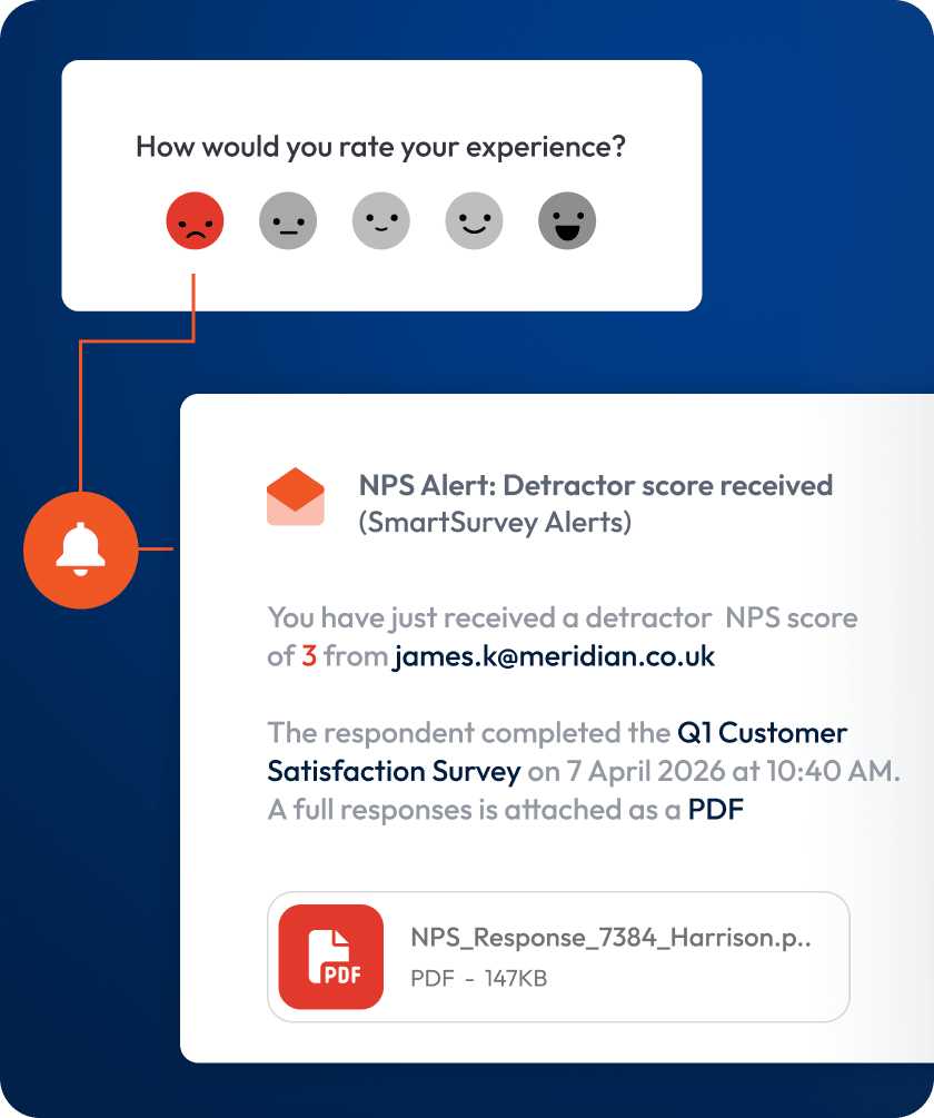 SmartSurvey gives you a full signal-to-action chain inside one platform. Build advanced surveys with logic and personalisation, distribute them across email, web, SMS, and QR codes, and route alerts to the right people the moment specific responses come in. Conditional email triggers, webhooks, and native integrations with Slack, Teams, and your CRM mean you can act on feedback without switching tools.