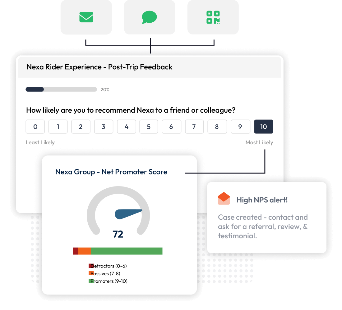 Turn positive responses into fresh revenue. Use our integrations to launch referral or review campaigns, or trigger upsell journeys in other platforms when customers are most engaged.