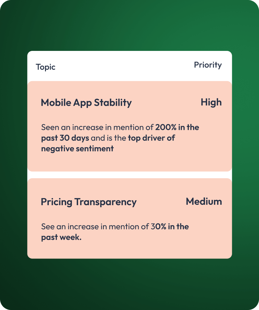 Instantly uncover patterns, pain points, and opportunities in what customers actually say in seconds with AI
