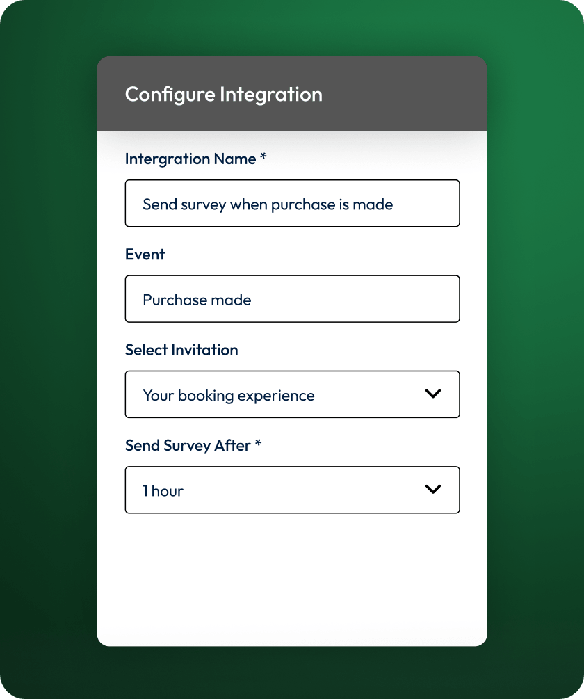 For example, you might request an integration with your CRM where a survey is triggered whenever a contact's lifecycle status updates to customer, or you might want an integration where NPS detractors automatically generate a ticket in your help desk, incorporating the survey response into the ticket.