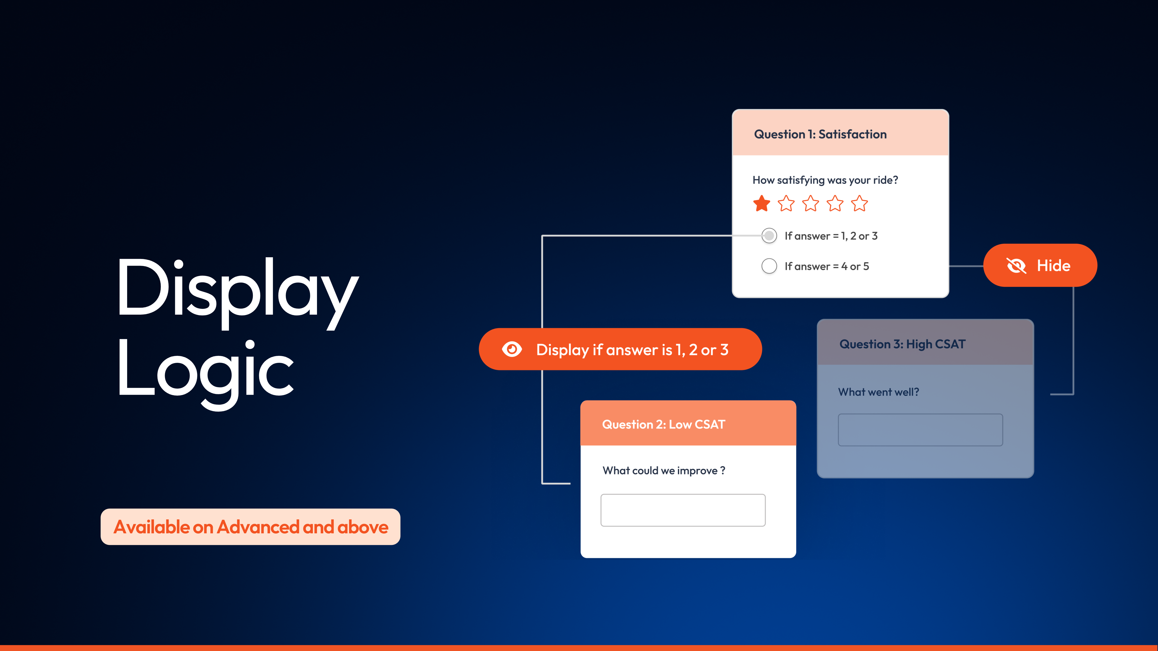 Display Logic lets you build a single survey that adapts to each respondent based on their answers, metadata, and custom variables. Instead of forcing everyone through the same long form, or maintaining separate surveys for different audiences, you set conditions that control which pages, questions, and answer options appear.